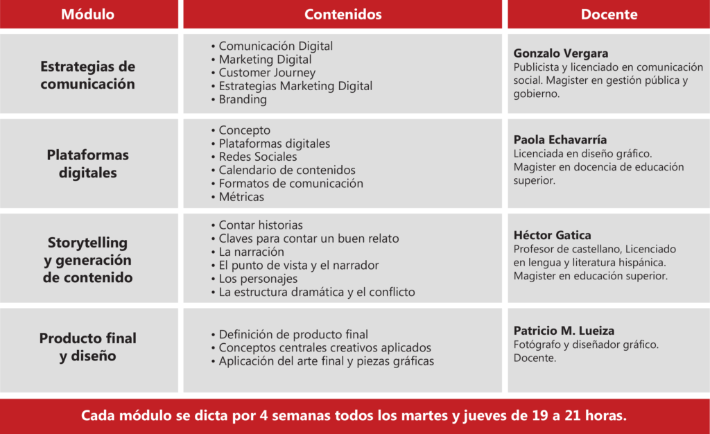 El diplomado tiene un énfasis en la modalidad práctica, en formato de taller en donde los estudiantes van generando contenidos memorables, diseñando estrategias, empleando plataformas digitales y elaborando un producto final pertinente a los objetivos comunicacionales que se plantea y a las necesidades que quiere satisfacer.